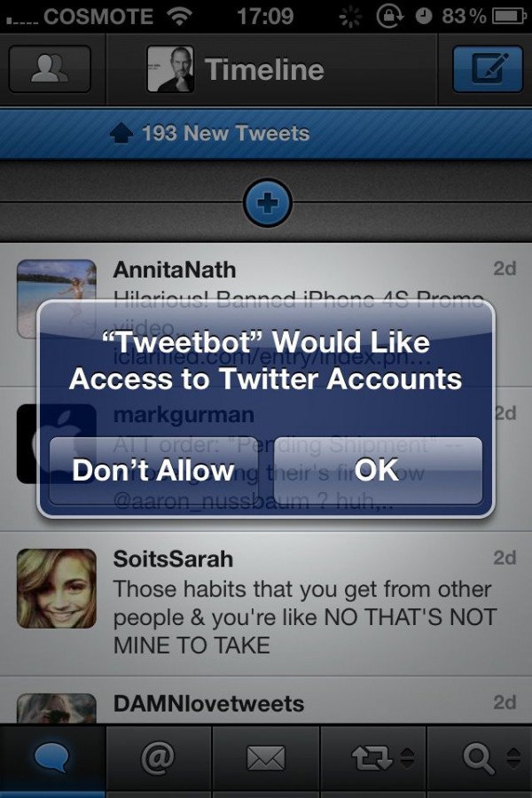 Πριν από την αναβάθμιση της επίσημης εφαρμογής του Twitter, αναβαθμίστηκε το Tweetbot, μια μοναδική εφαρμογή για το Twitter που μας επιτρέπει αρκετά εύκολα να συνομιλούμε με φίλους μας, να κάνουμε εύκολα retweets, favorites και ότι άλλο θέλουμε μέσα από το απίστευτο γραφικό του περιβάλλον. Με την τελευταία του αναβάθμιση στην έκδοση 1.7 το Tweetbot είναι και αυτό πλήρως ενσωματωμένο στο iOS 5 όπως και η επίσημη εφαρμογή του Twitter.