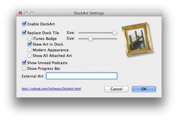 - Με το DockArt έχουμε και την δυνατότητα για διάφορες ρυθμίσεις, όπως το μέγεθος του εικονιδίου, την εμφάνιση της μπάρας/κατάστασης του κομματιού και άλλα.