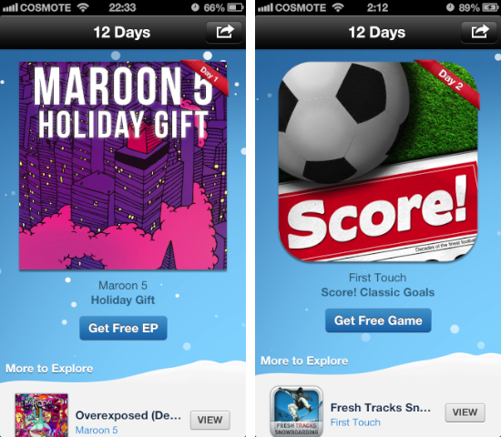 Read MoreΌπως υποσχέθηκε η Apple από χθες άρχισε να δίνει τα Χριστουγεννιάτικα δώρα μέσα από την εφαρμογή iTunes 12 Days of
