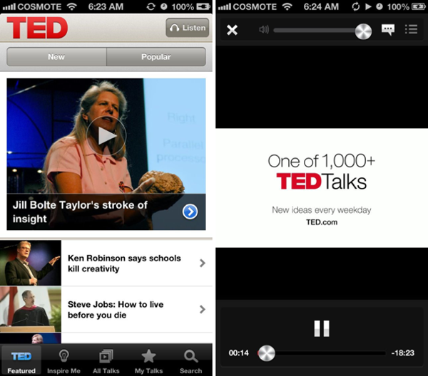 H επίσημη εφαρμογή TED για το iPhone και το iPad αναβαθμίστηκε πρόσφατα στην έκδοση 2.0. Με τη νέα έκδοση, όπως θα δούμε και στην περιγραφή η εφαρμογή γίνεται πιο γρήγορη και φέρνει την δυνατότητα για υπότιτλους ή μεταφράσεις.